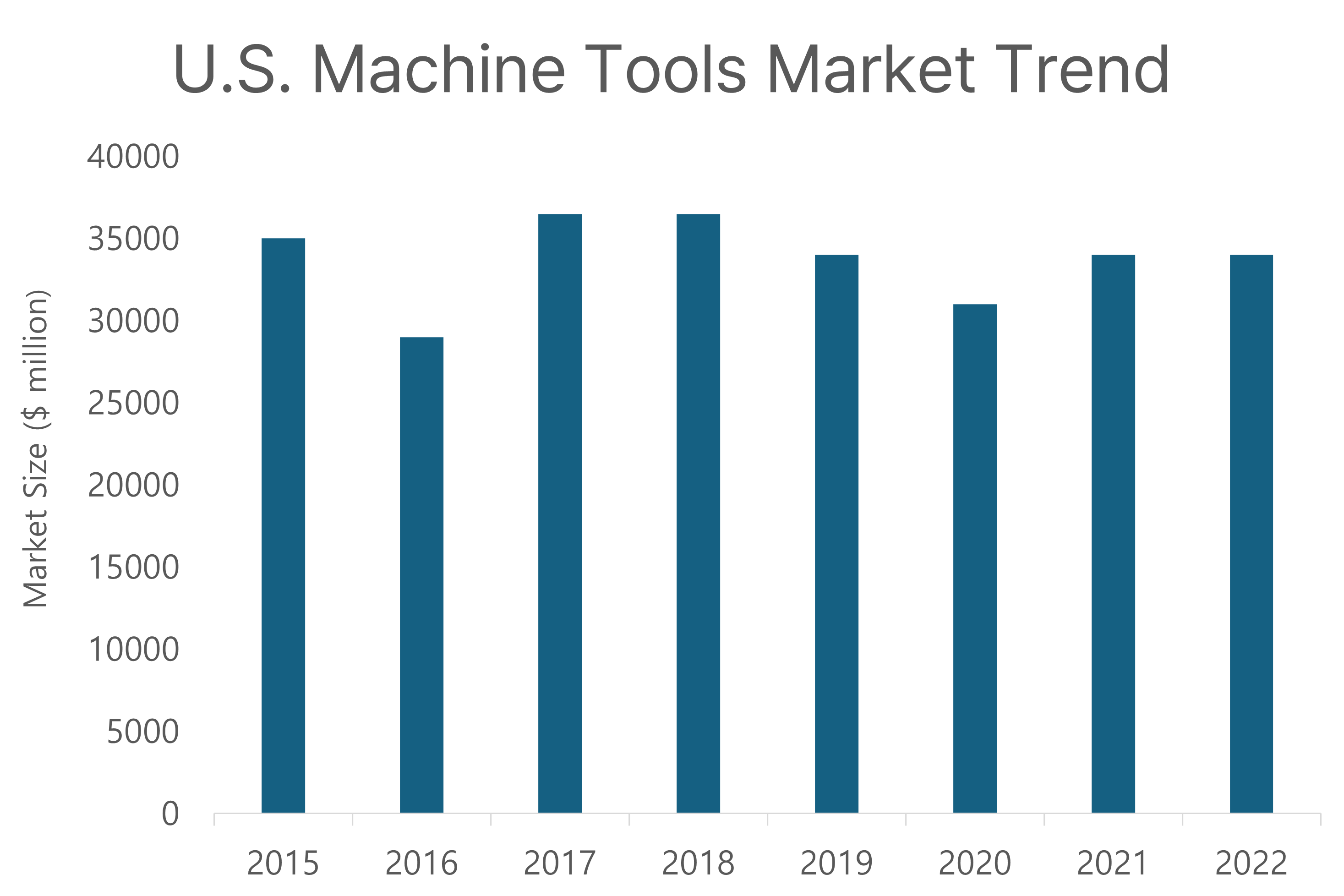 However, in 2021, the market showed a rapid recovery, growing significantly by 11.8% compared to the previous year, with the U.S. machine tool market reaching a size of $34 billion. In 2022, it is projected to grow by 4.8%, reaching a market size of $35.7 billion.