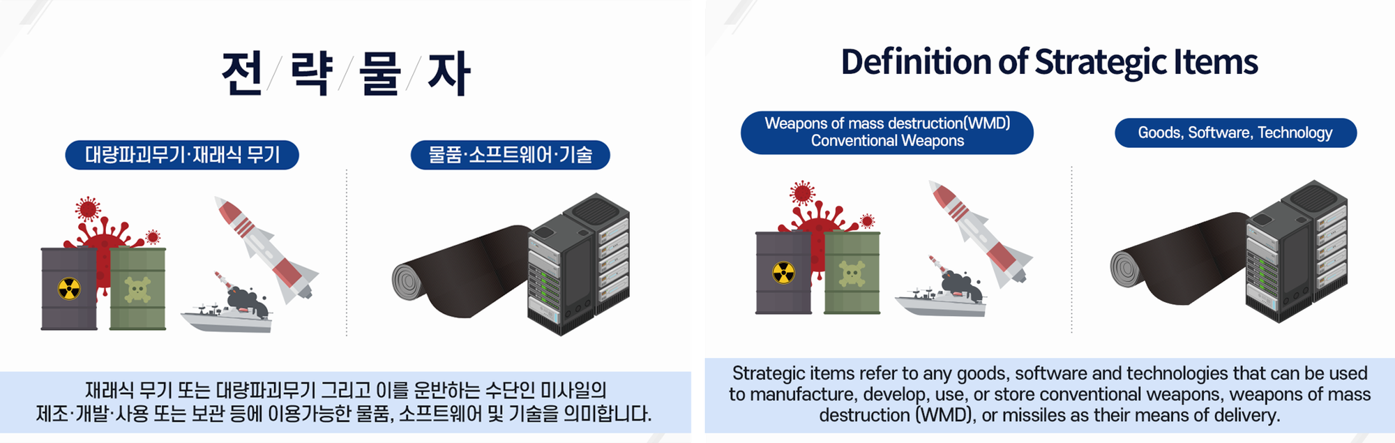 Strategic items refer to items and technologies that can be used for the manufacture, development, and use of weapons of mass destruction (WMD), conventional weapons, and their delivery systems.