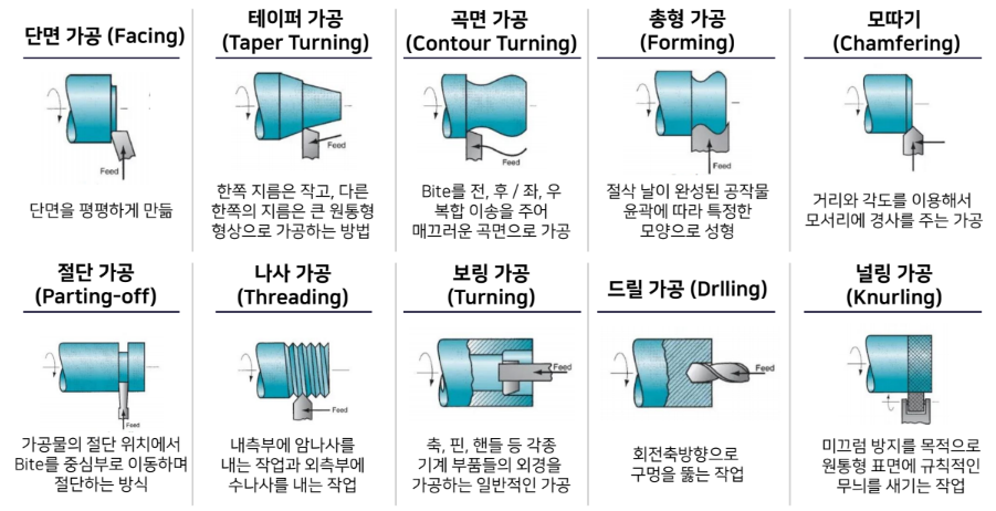 There are a total of 10 machining types based on the bite: facing, taper turning, contour turning, forming, chamfering, parting-off, threading, boring, drilling, and knurling.