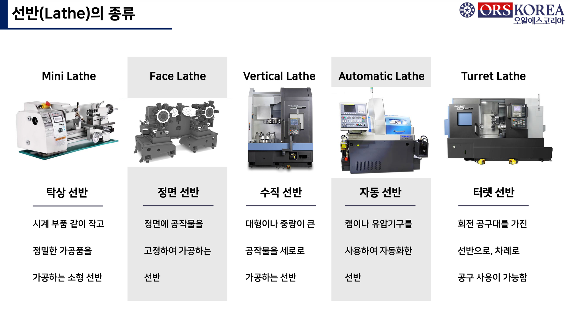 선반에는 다양한 종류가 있으며, 그 중 탁상 선반 (Mini Lathe), 정면 선반 (Face Lathe), 수직 선반 (Vertical Lathe), 자동 선반 (Automatic Lathe), 터렛 선반 (Turret Lathe)에 대해 간단히 소개해 보려고 합니다.