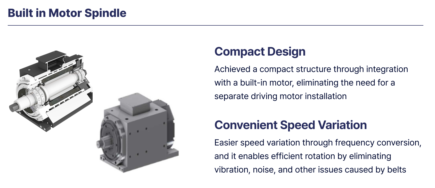 - 빌트인 모터 스핀들(Built-in Motor Spindle): 콤팩트한 디자인으로 별도의 구동 모터 설치가 필요 없어 설치 과정을 간소화하고 부드럽고 효율적인 속도 제어를 제공합니다.