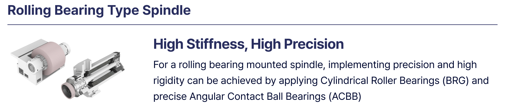 - 롤링 베어링 스핀들(Rolling Bearing Spindle): 높은 정밀도가 요구되는 작업에 적합한 이 스핀들은 원통 롤러 베어링과 각 접촉 볼 베어링을 사용하여 뛰어난 강성을 달성합니다.