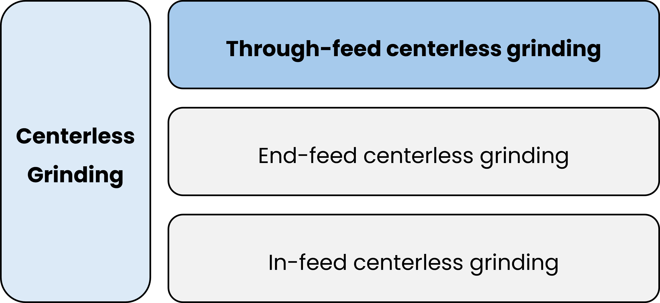 There are three types of centerless grinding : through-feed centerless grinding, end-feed centerless grinding, and in-feed centerless grinding.