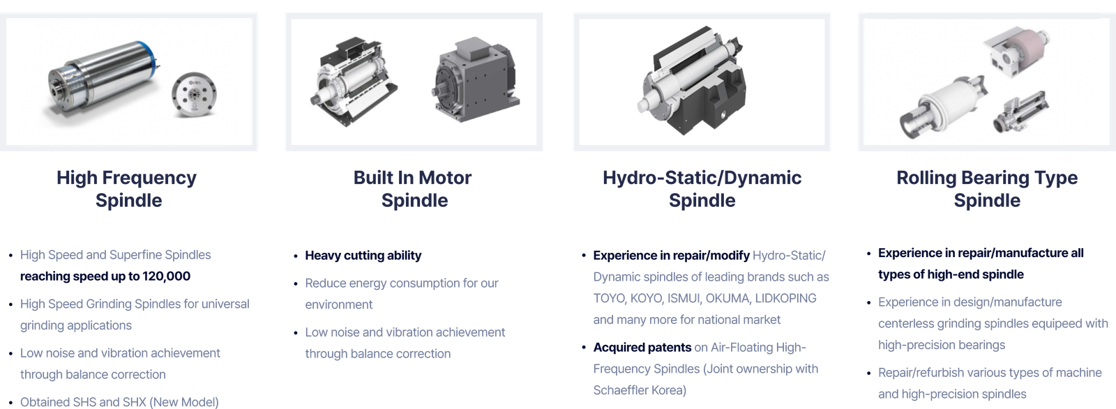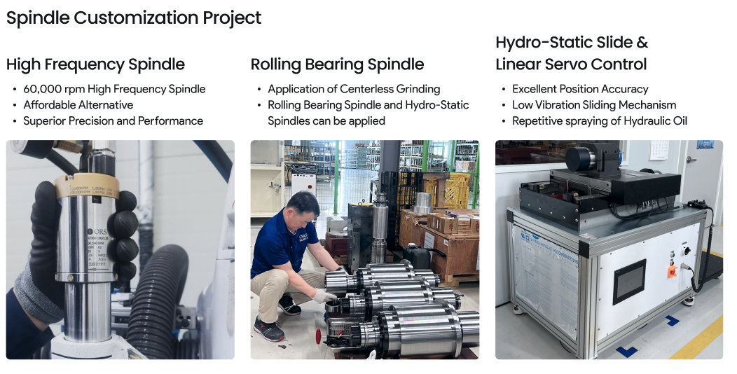 For spindles, ORSKOREA manufactures high-frequency spindles, belt-driven spindles, built-in-motor spindles, and hydraulic spindles - all controllable at desired speeds.
