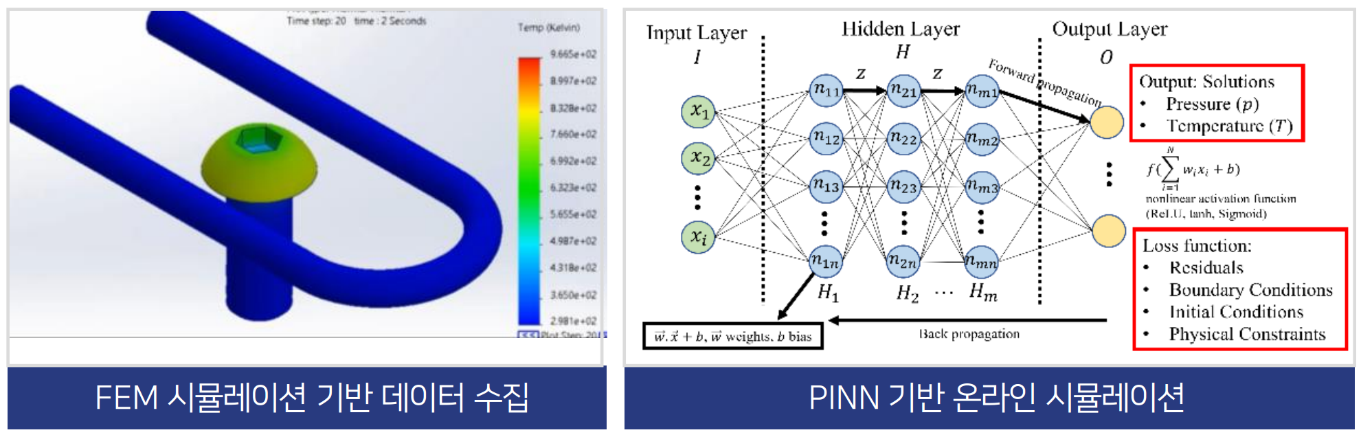 이 가공품 품질 예측 기술은 초음파 신호를 유한 요소 해석(FEA)을 통해 실제 물리법칙을 기반으로 한 데이터를 획득하고, PINN 기반의 시뮬레이션 모델을 활용하여 온도와 경도를 예측할 수 있습니다.
