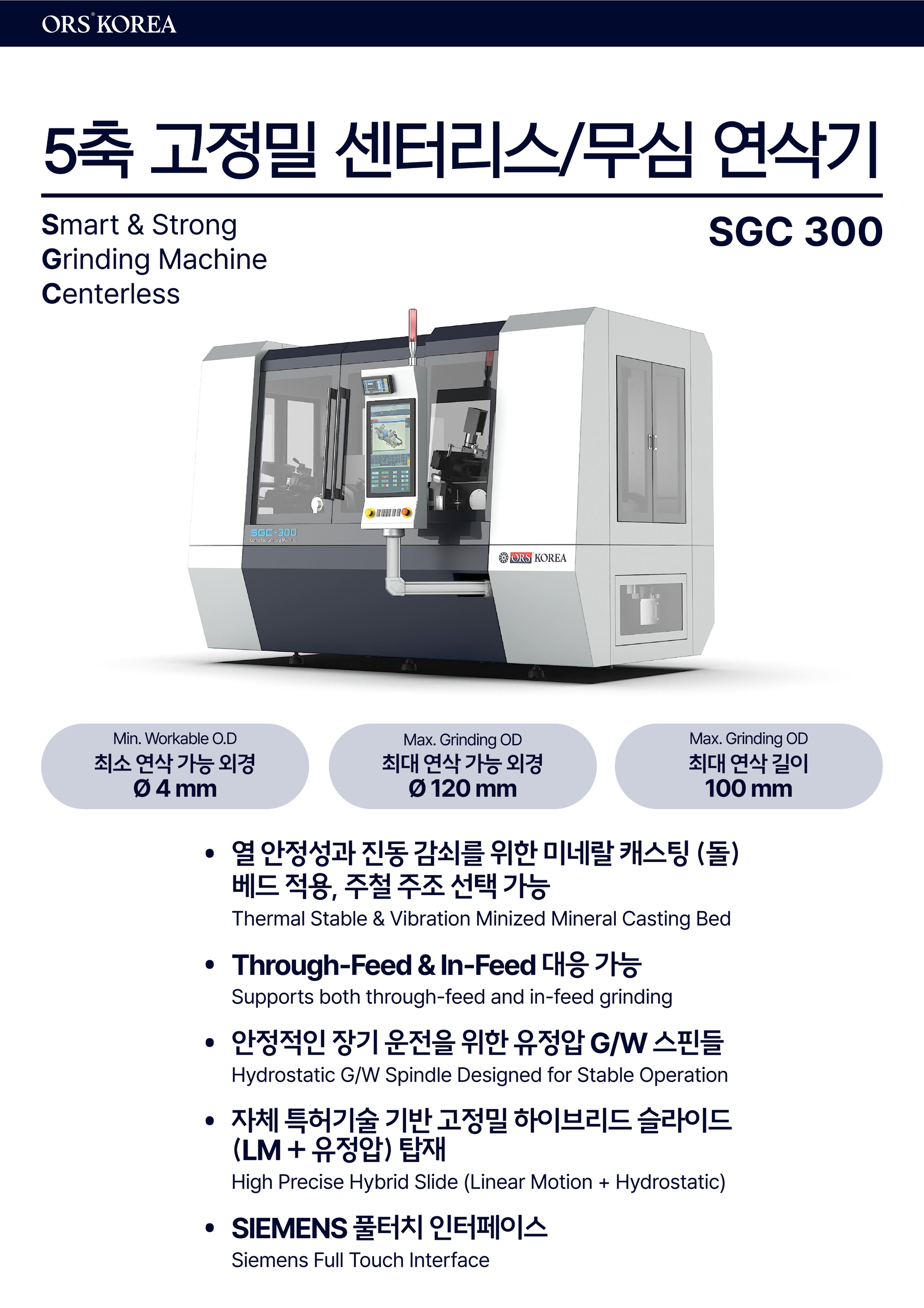 이번에 전시된 SGC 300 모델은 미네랄 캐스팅 베드 구조를 적용하여 열 안정성과 진동 감쇠 성능을 확보하고, 장시간 연속 가공 시에도 공정 변동을 최소화할 수 있도록 설계되었습니다. 또한 유정압 G/W 스핀들과 하이브리드 슬라이드 구조를 통해 이송 안정성과 반복 정밀도를 동시에 확보하면서, 작업 조건 변화에도 흔들림 없는 가공 품질을 유지하는 것이 특징입니다. 이러한 구조는 특히 작업자 개입을 최소화한 자동화 라인에서도 안정적인 생산을 가능하게 합니다.