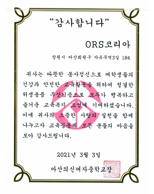 2021년도 3월 3일, 마산 여자 중학교 (공식인스타그램 https://www.instagram.com/lily_of_the_valley_103/) 에서 위생 용품 전달식이 진행됐다. 이 날 행사에는 오알에스코리아(www.orskorea.com)가 참여했습니다.